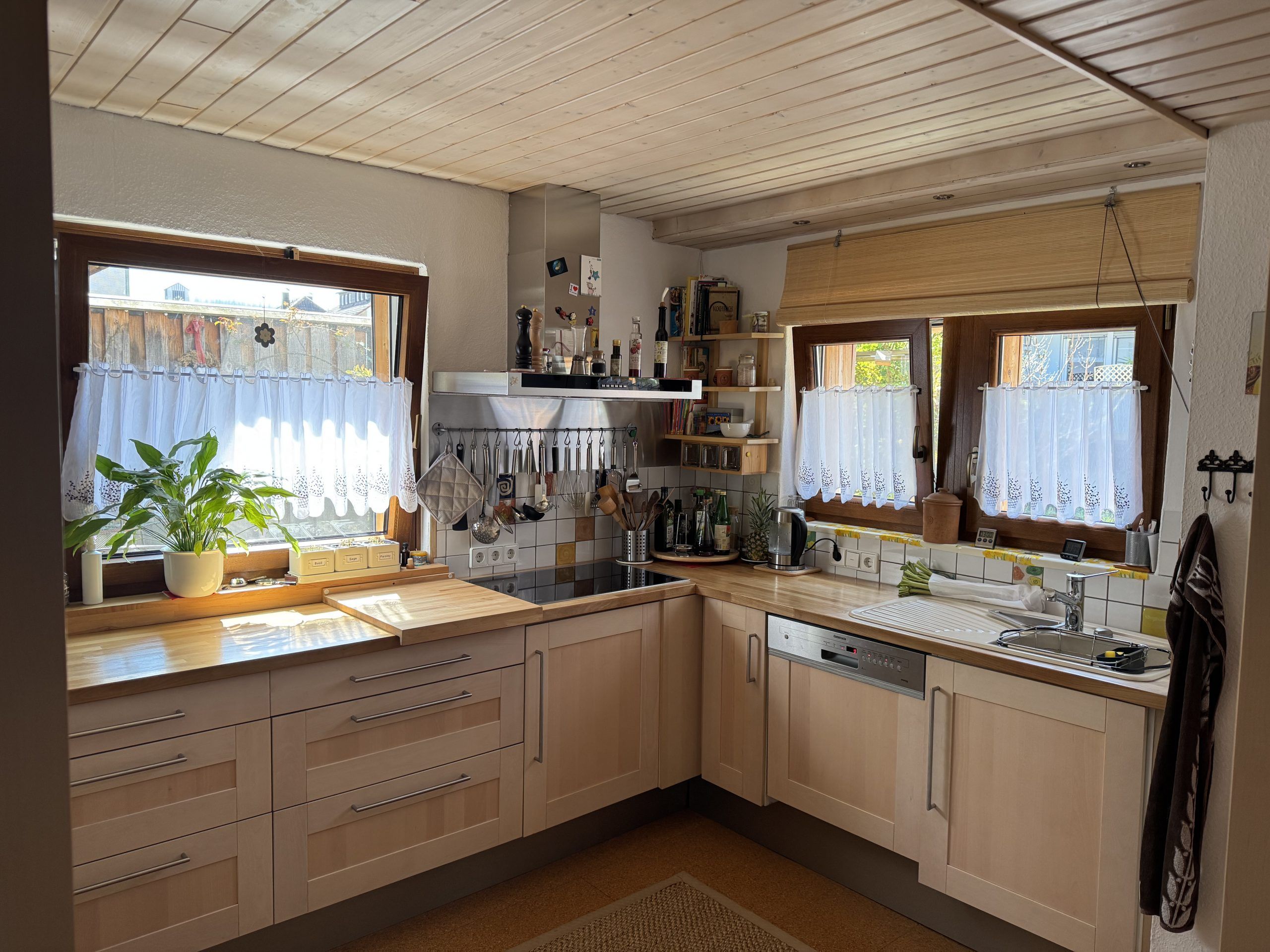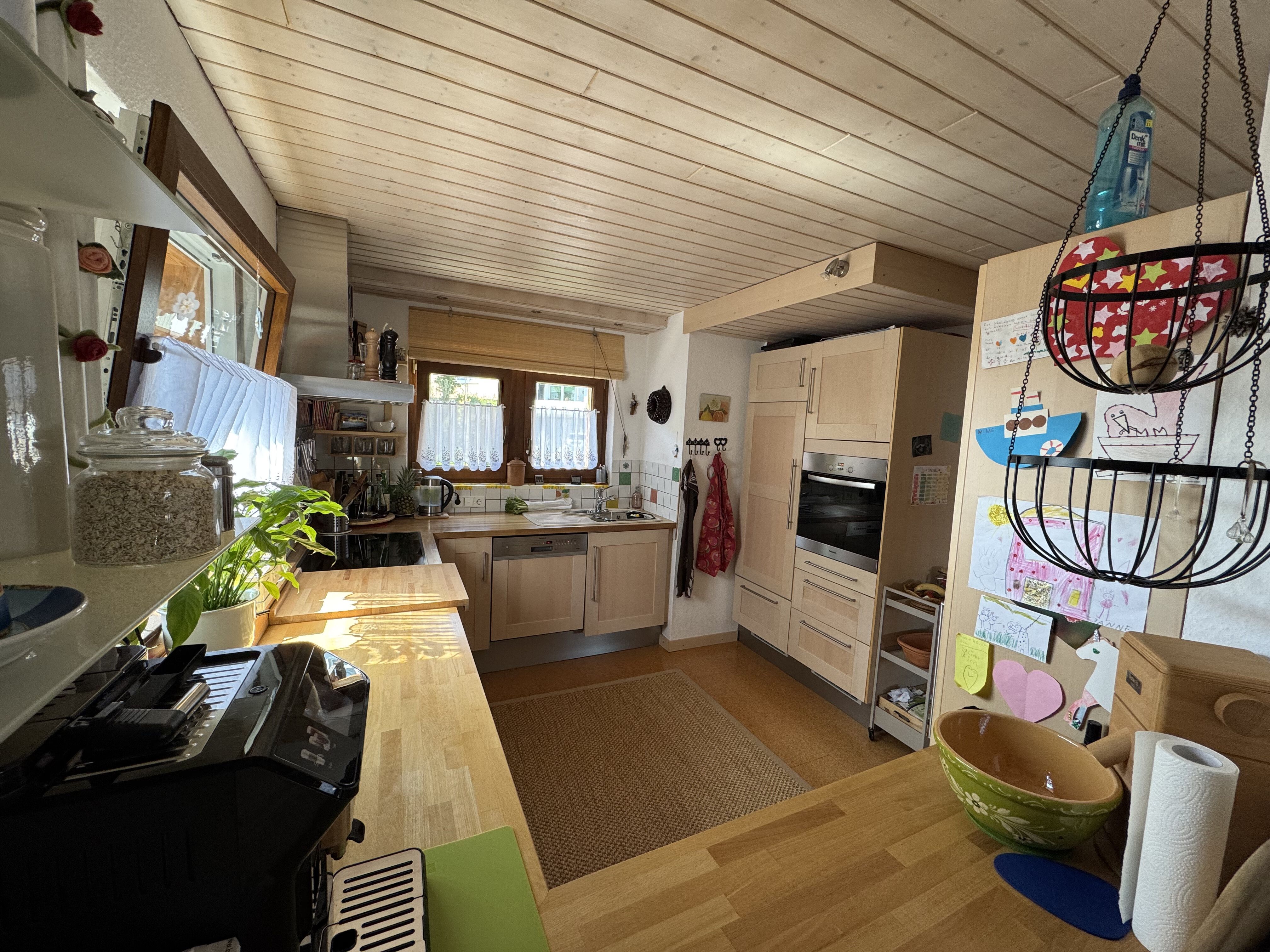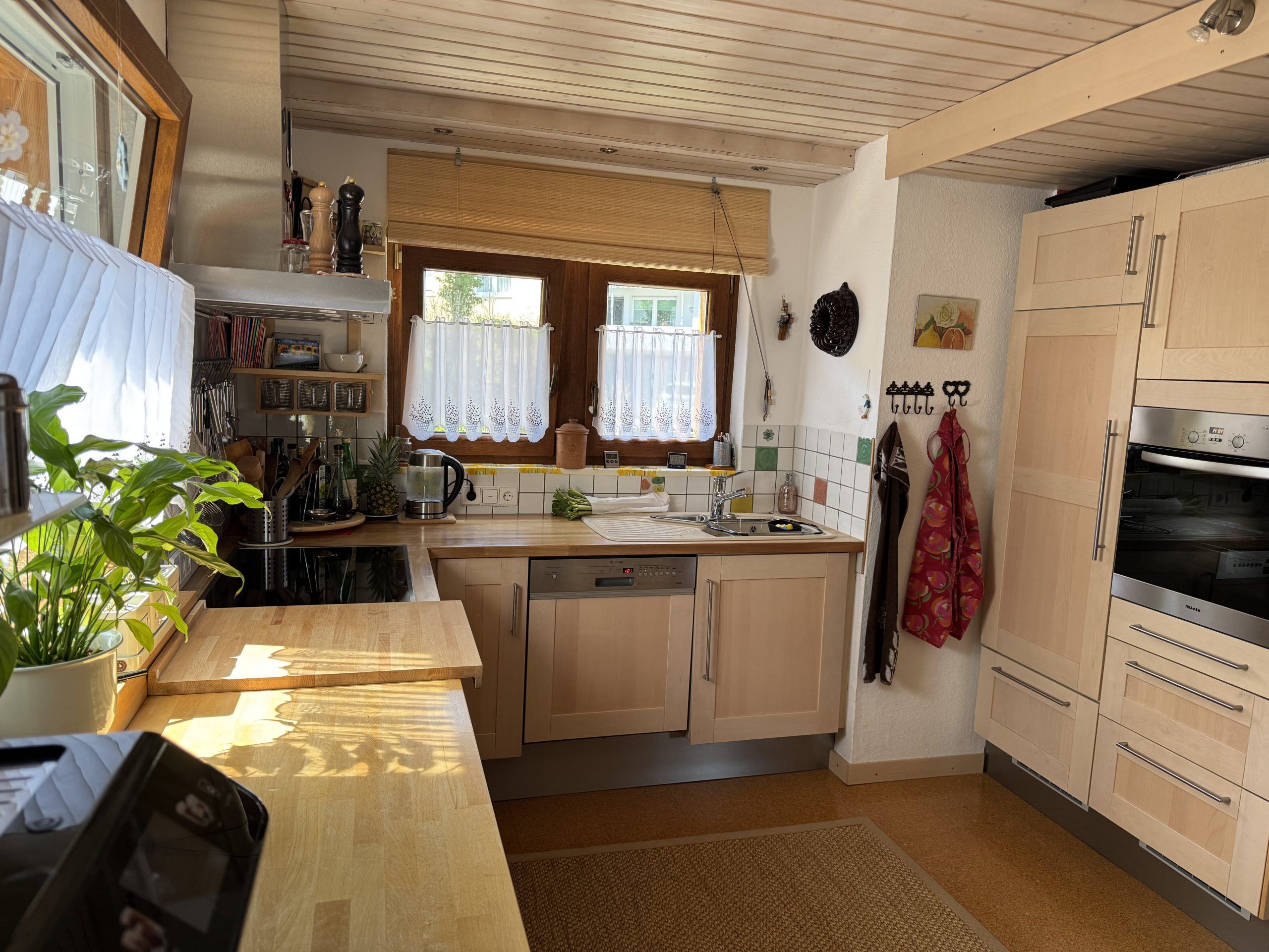 Die offen gestaltete Küche bietet reichlich Platz zum Kochen und Backen. Die Einbauküche mit den hochwertigen Elektrogeräten ist enthalten.