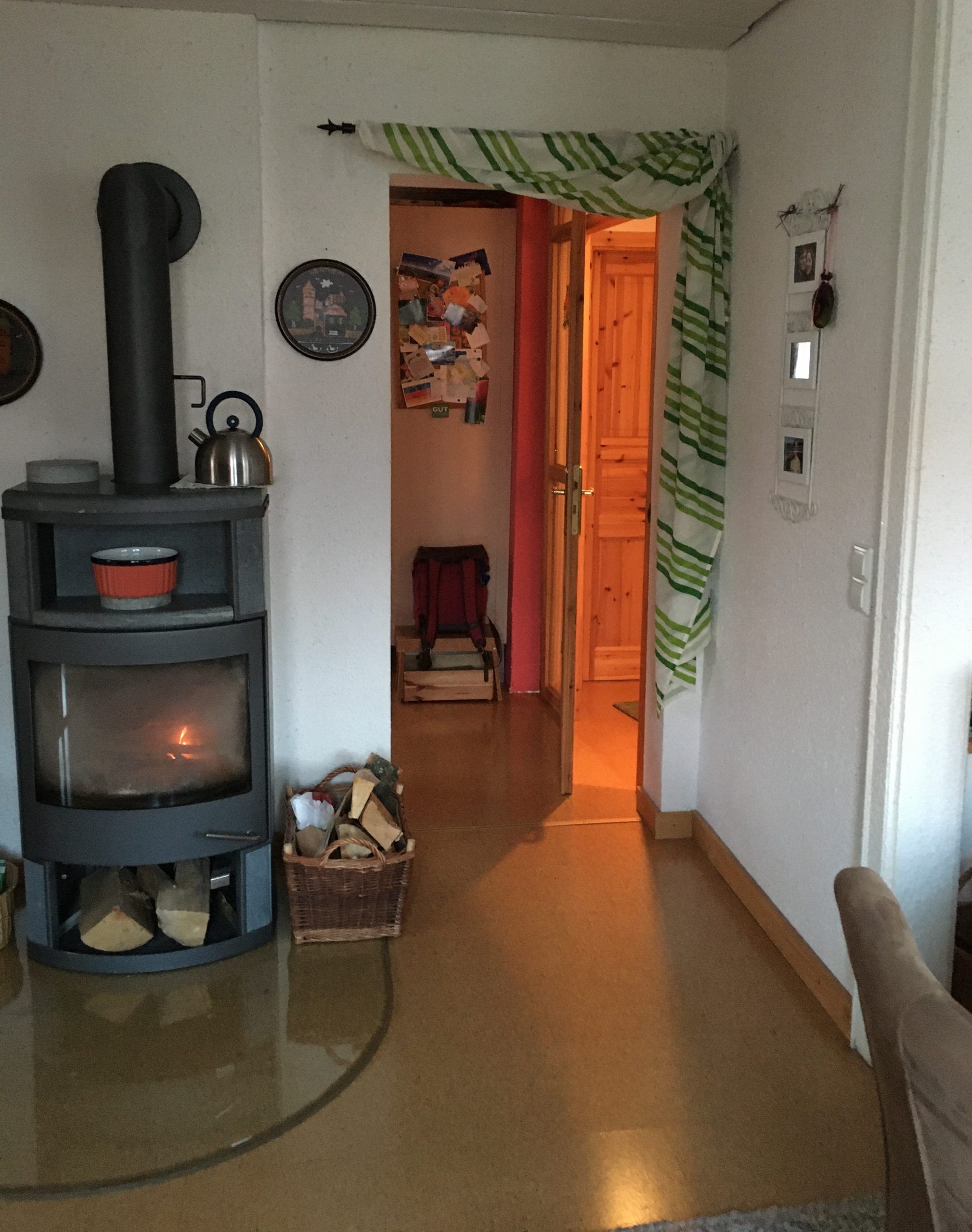Auch das Esszimmer besticht mit vielen Fenstern mit Sicht auf den Wald, der Ofen verbreitet vor allem in der kalten Jahreszeit eine gemütliche Atmosphäre.